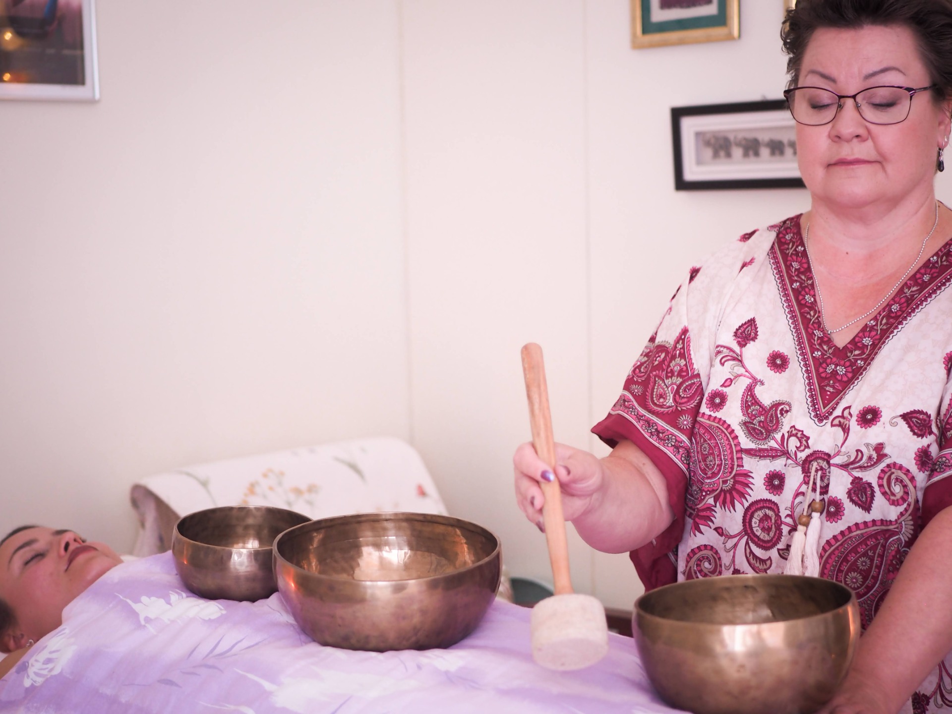 Äänimaljahoidossa Sinä saat rentoutua lempeästi hoitopöydällä, hämärässä, pehmeiden peittojen alla. Minä soitan tiibetiläisiä äänimaljoja kehosi päällä ja vierellä. Olen vain Sinua varten.